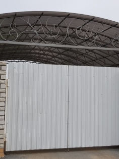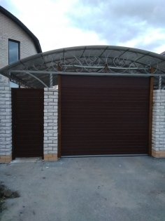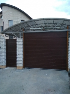 Уличные ворота под навес, изначально конструкция проема не позволяла смонтировать секционные ворота, пришлось внутрь проема наварить профильную трубу к закладным оставшимся от распашных ворот (клиент отказался от покраски трубы). Также рядом установили калитку, тоже с сэндвич панелей, калитка Алютех. С этим объектом оказалась сложность в эксплуатации, т. к. навес расположен с подветренной стороны, зимой в направляющие насыпало снега, а когда выступало солнце металл нагревался и снег таял, после чего клонили ролики в направляющих, проблему решили только с помощью закрывания верхней части навеса поликарбонатом, чтобы снег не попадал в направляющие, после этого решения проблем больше не было.