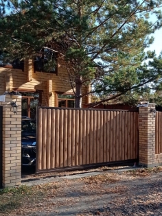 Для въезда на склад выбрал створки из металлического штакетника. Они недорогие, смотрятся красиво, привод есть, удобные в использовании. Мастер помог с выбором ставней, я долго выбирал, смотрел, что лучше. В итоге недорогие ворота уже несколько недель использую, никаких замечаний по установке нет. Цвет золотой дуб, смотрятся красиво.